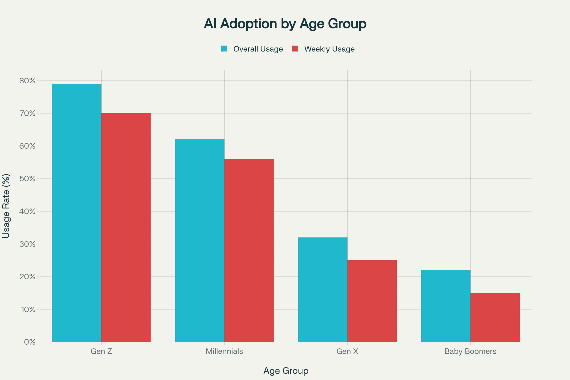 Look at that chart carefully. Gen Z leads in usage but what it doesn't show is the expertise gap. While Millennials use AI 56% weekly but show 62% expertise, Gen Z's 70% usage yields only 50% expertise.